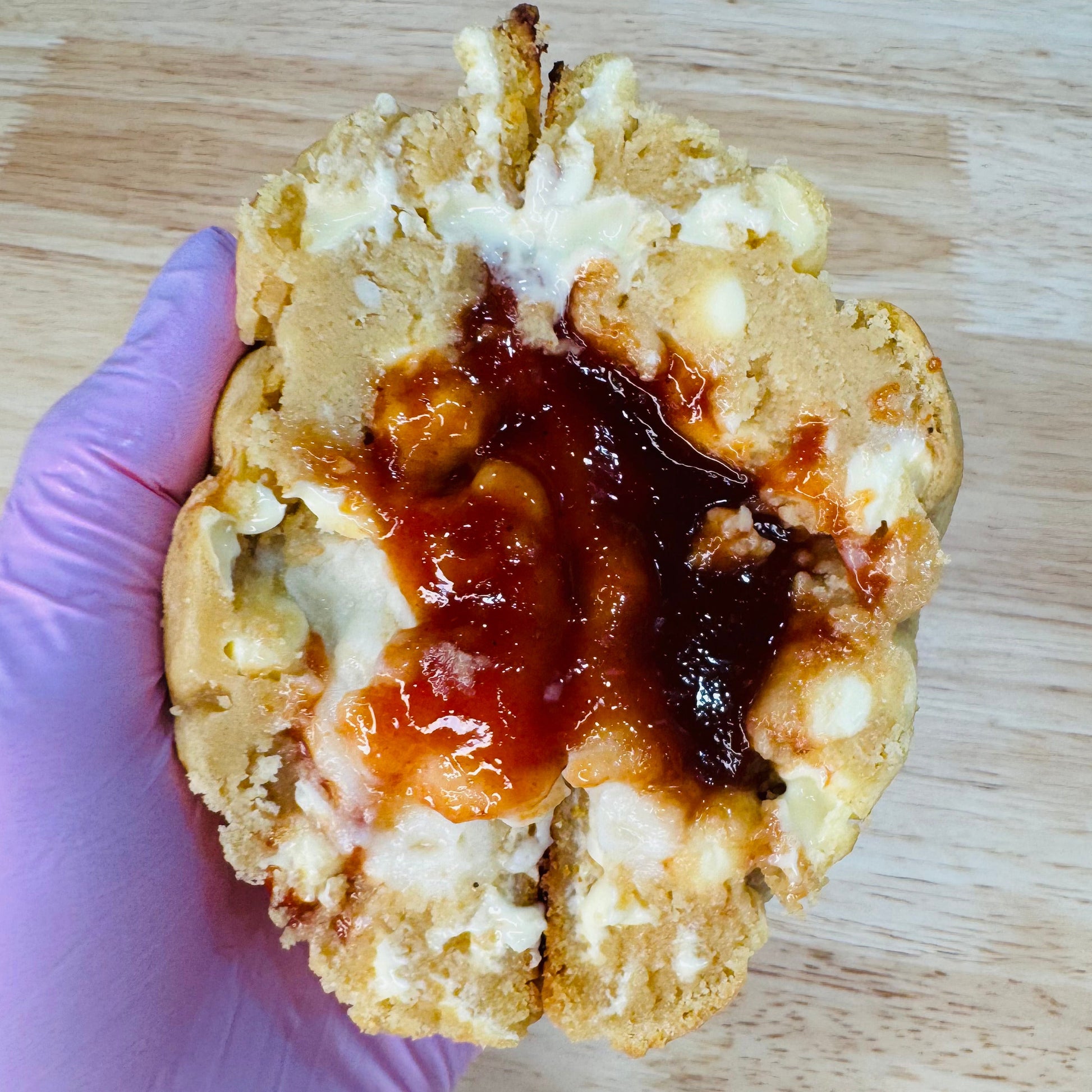 Nuestra galleta más clásica al estilo Caribbean comfort. Una masa suave de vainilla , con chips de chocolate blanco, rellena de mermelada de guava casera, la misma mermelada que uso en mis bizcochos dominicanos, y un cremosito relleno de queso crema que se derrite cuando la abres. Dulce, cremosa y totalmente irresistible si amas la guava con queso… pero en versión galleta gigante.